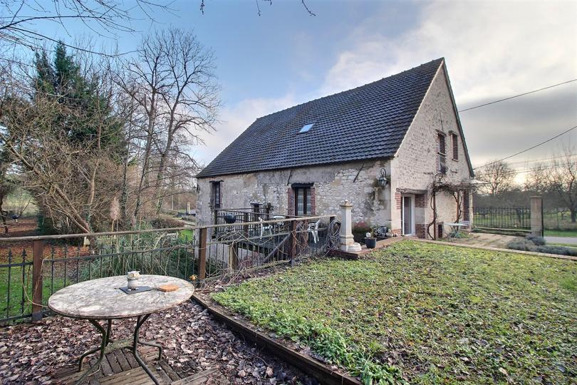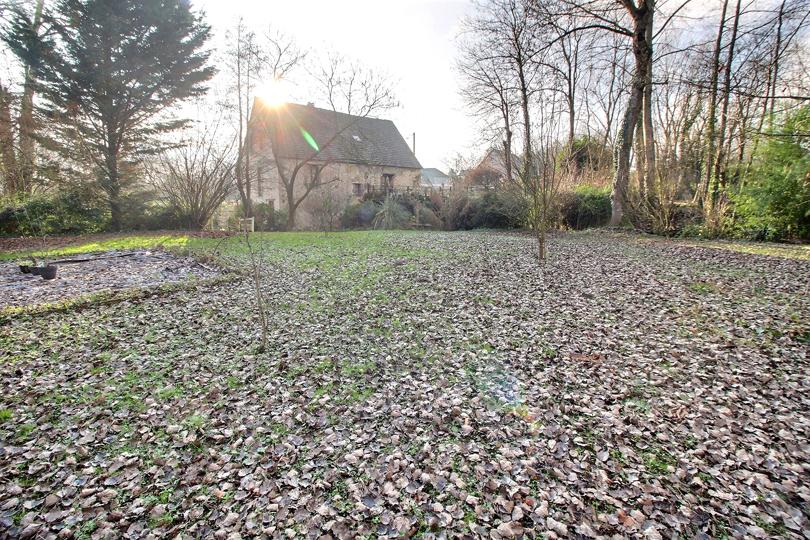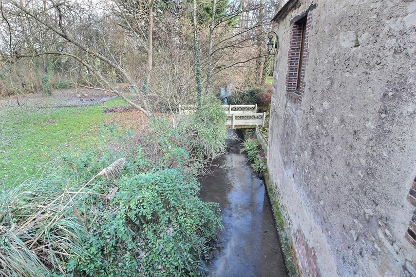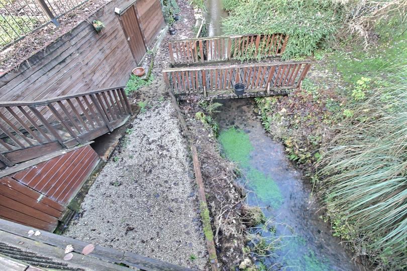 Terrain clos et arboré parcouru par un ruisseau avec terrasse, jardin et aire de stationnement |
