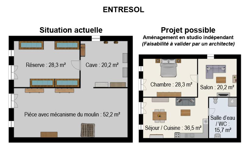 Surface habitable actuelle de la maison : 225,5 m² (Avec réaménagement de l'entresol : 326,2 m² de surfaces habitables au total) Toutes les mesures indiquées ci-dessous sont calculées intra-muros |