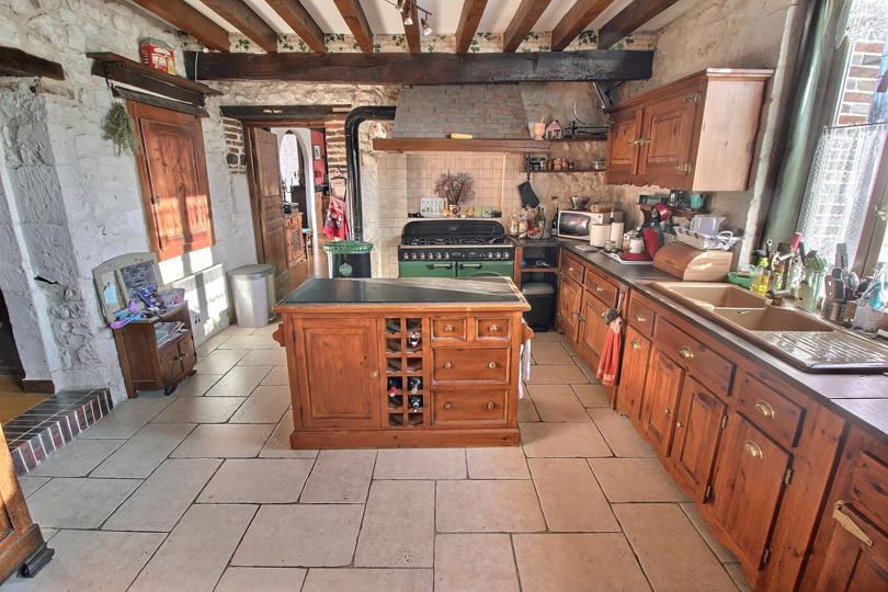 Cuisine séparée, aménagée et équipée sur carrelage avec piano de cuisson |