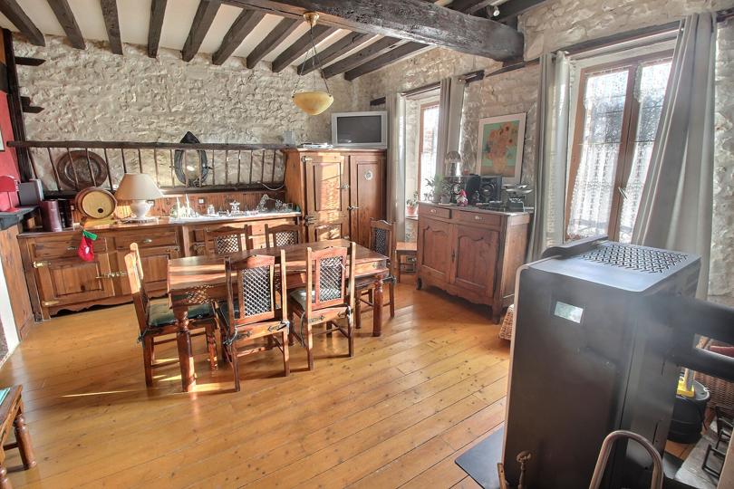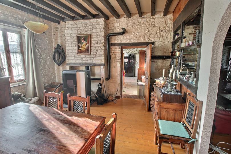 Salle à manger sur parquet massif avec poêle à granulés |